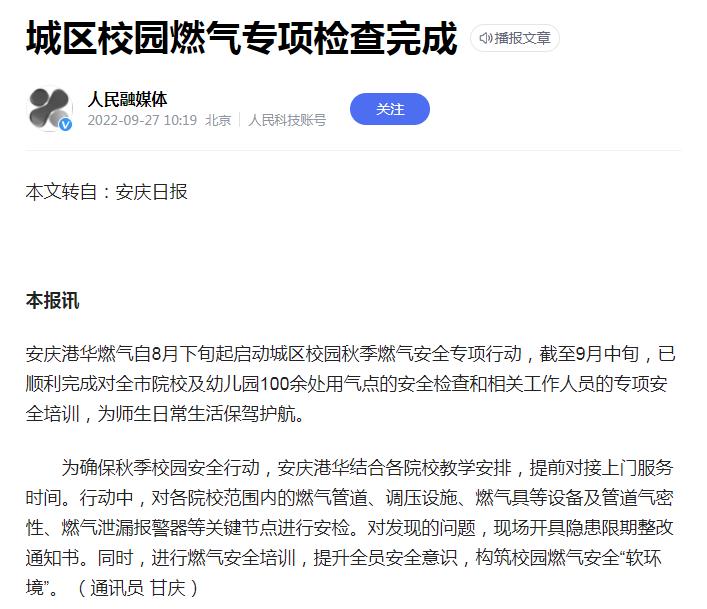 城區(qū)校園燃氣專項檢查完成(轉載于人民網融媒體)