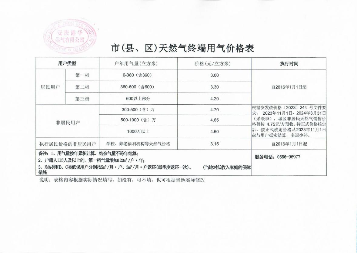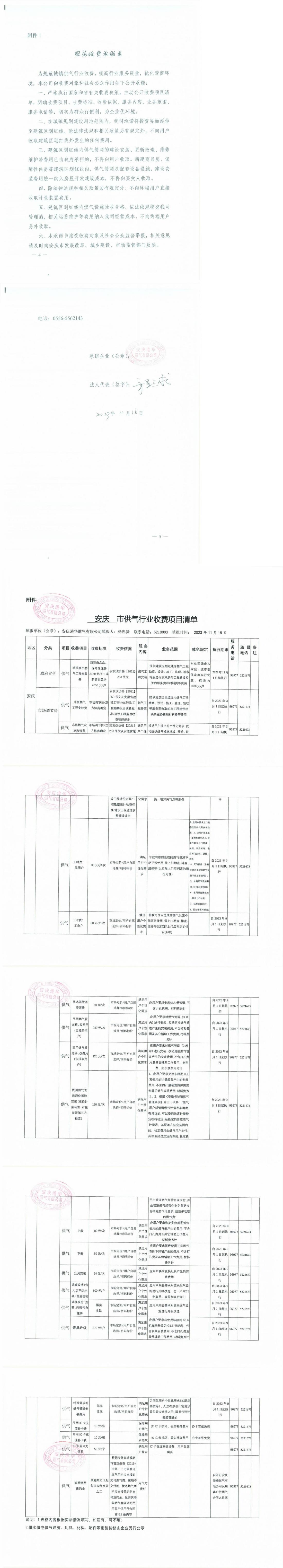 安慶港華規(guī)范收費承諾書(含行業(yè)收費項目清單及終端用氣價格表)