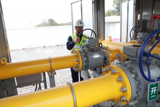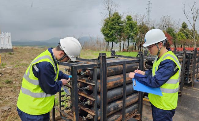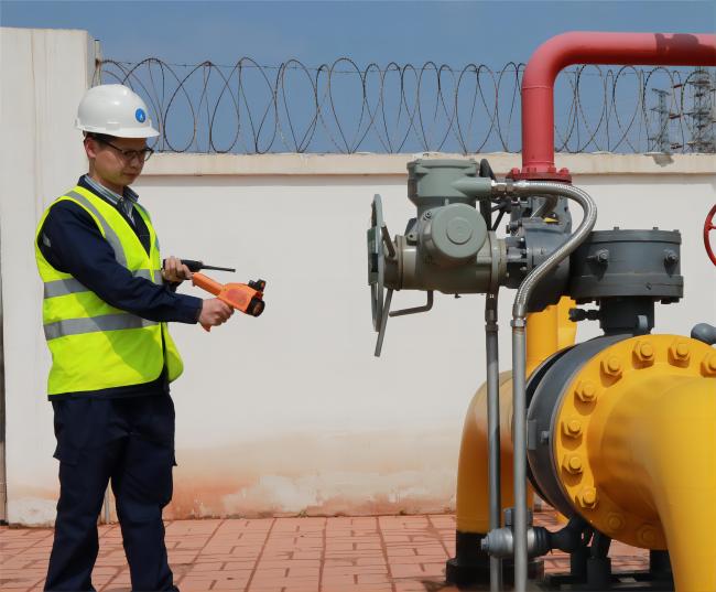 12時(shí)08分,置換作業(yè)開始。確定管道內(nèi)氣體成分比例符合要求后,置換組緩慢開啟1號(hào)閥門,向管網(wǎng)內(nèi)輸送天然氣,并由調(diào)度中心對(duì)管網(wǎng)內(nèi)壓力情況跟進(jìn)、監(jiān)測(cè)。正午時(shí)分,驕陽(yáng)似火,檢測(cè)人員們一邊吃著盒飯一邊堅(jiān)守施工現(xiàn)場(chǎng)觀測(cè)數(shù)據(jù)。終于,14時(shí)16分,現(xiàn)場(chǎng)調(diào)度的對(duì)講機(jī)內(nèi)傳來(lái)放散塔檢測(cè)人員的聲音:“經(jīng)檢測(cè),管網(wǎng)內(nèi)燃?xì)夂恳堰_(dá)99.7%,置換合格。”