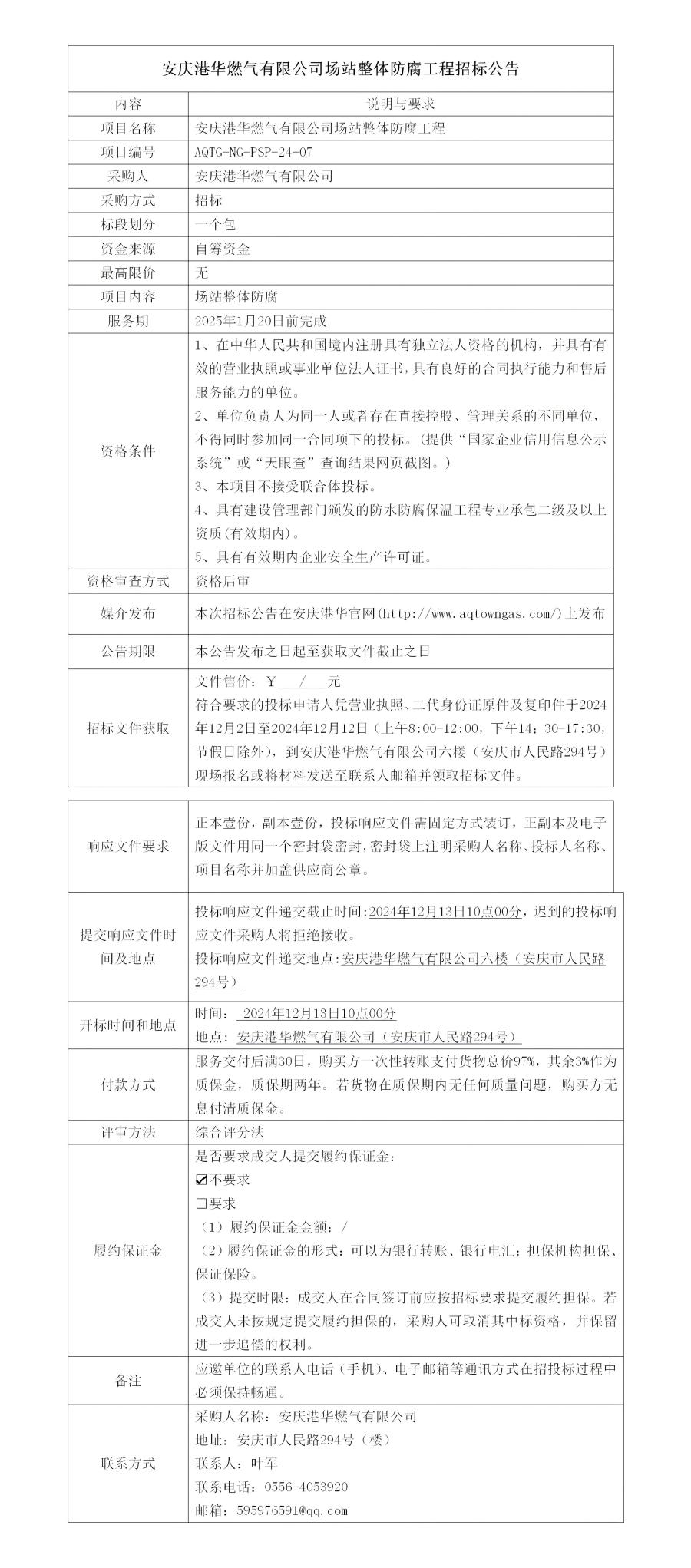 安慶港華燃氣有限公司場站整體防腐工程招標公告