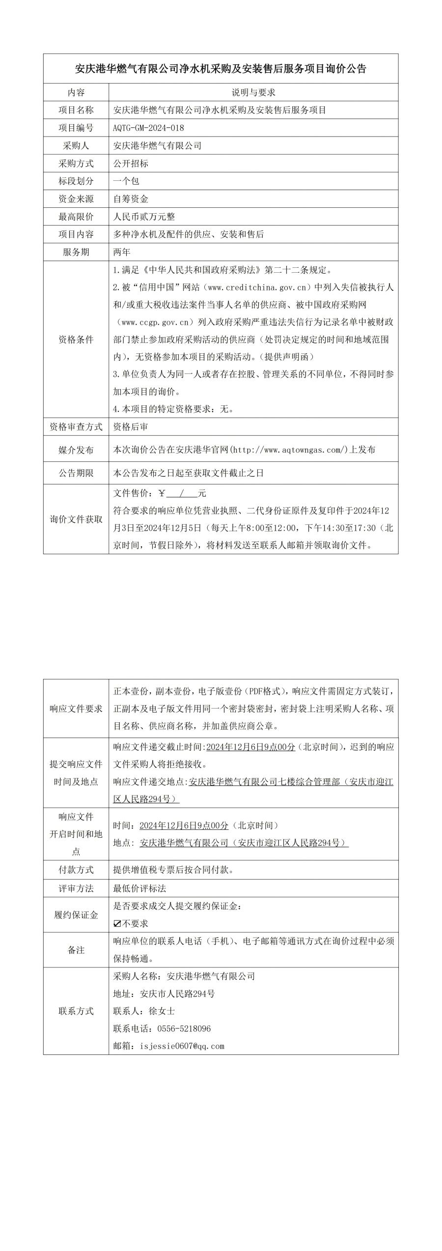 安慶港華燃氣有限公司凈水機采購及安裝售后服務項目詢價公告