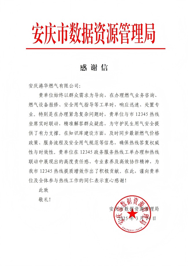 3月24日,安慶市數(shù)據(jù)資源管理局向安慶港華發(fā)來(lái)感謝信,對(duì)我司2024年燃?xì)鉄峋€問(wèn)題辦理的工作成效給予充分肯定。