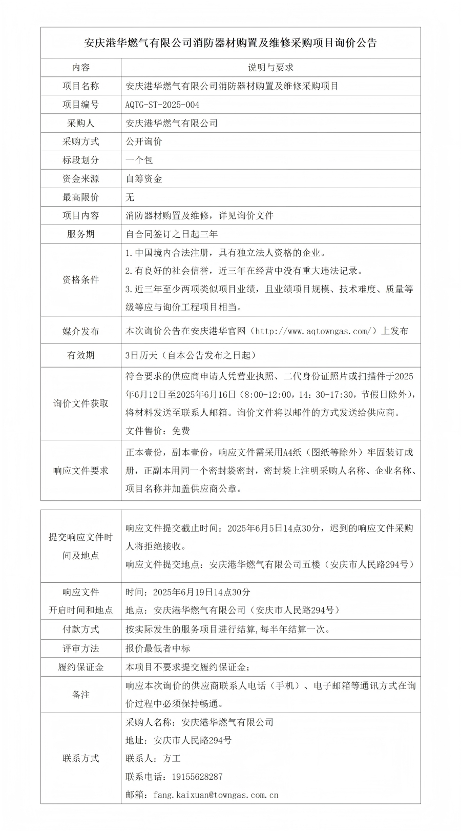 安慶港華燃氣有限公司消防器材購置及維修采購項目詢價公告 發(fā)布時間:2025-06-12    閱讀次數(shù):1517次