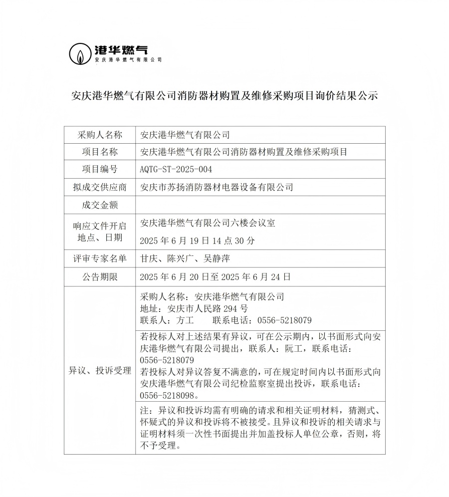 安慶港華燃?xì)庥邢薰鞠榔鞑馁徶眉熬S修采購項(xiàng)目詢價(jià)結(jié)果公示