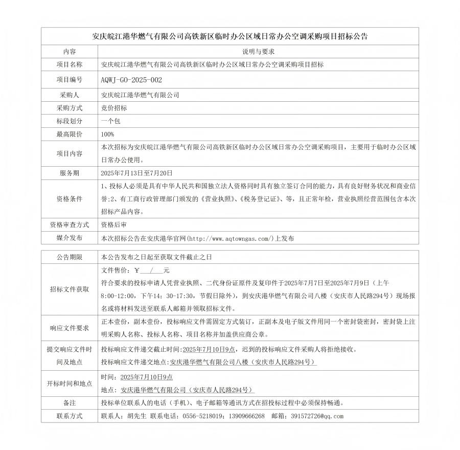 安慶皖江港華燃氣有限公司高鐵新區(qū)臨時辦公區(qū)域日常辦公空調(diào)采購項目招標公告