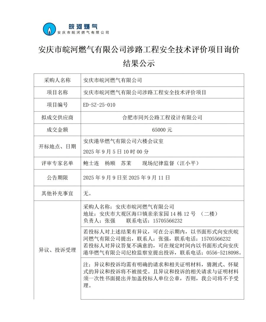 安慶市皖河燃?xì)庥邢薰旧媛饭こ贪踩夹g(shù)評價項(xiàng)目詢價結(jié)果公示