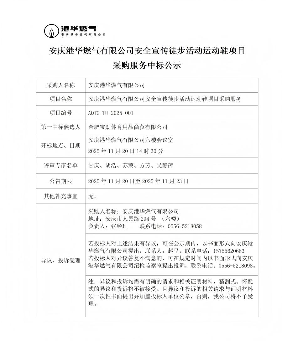 安慶港華燃?xì)庥邢薰景踩麄魍讲交顒舆\動鞋項目采購服務(wù)中標(biāo)公示