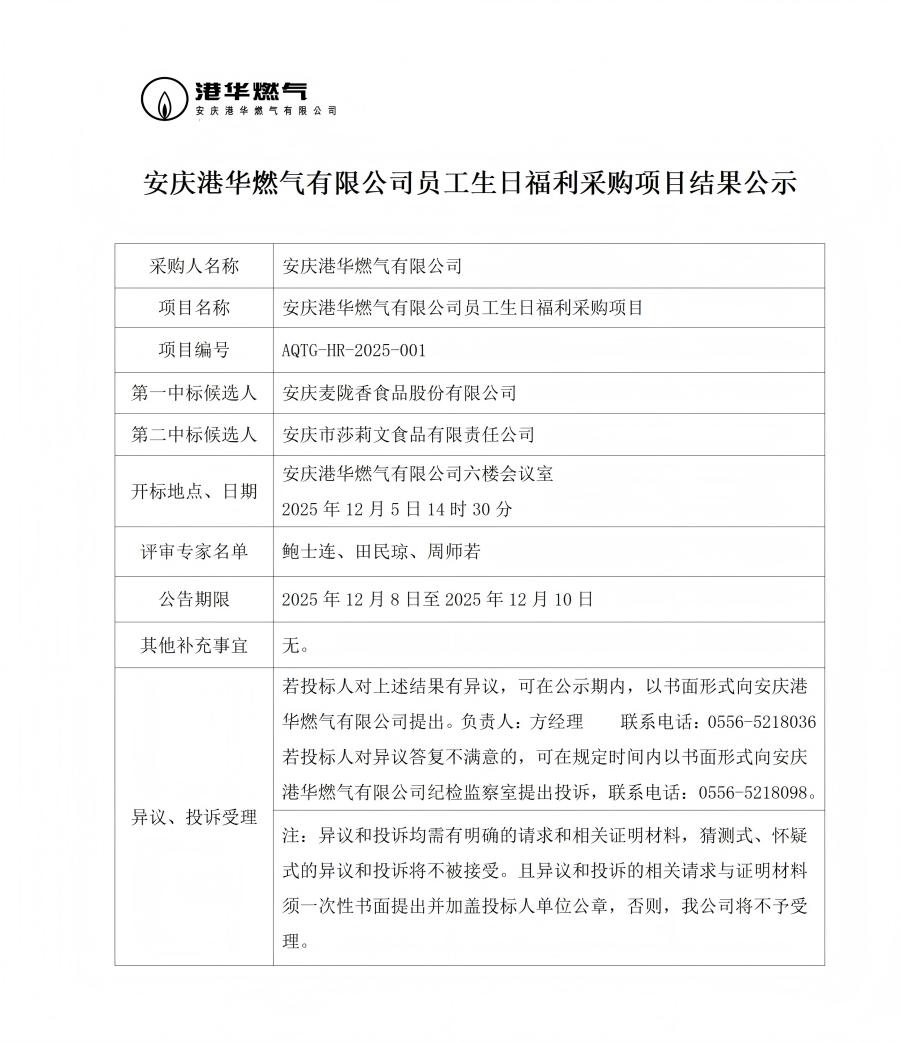 安慶港華燃?xì)庥邢薰締T工生日福利采購(gòu)項(xiàng)目結(jié)果公示