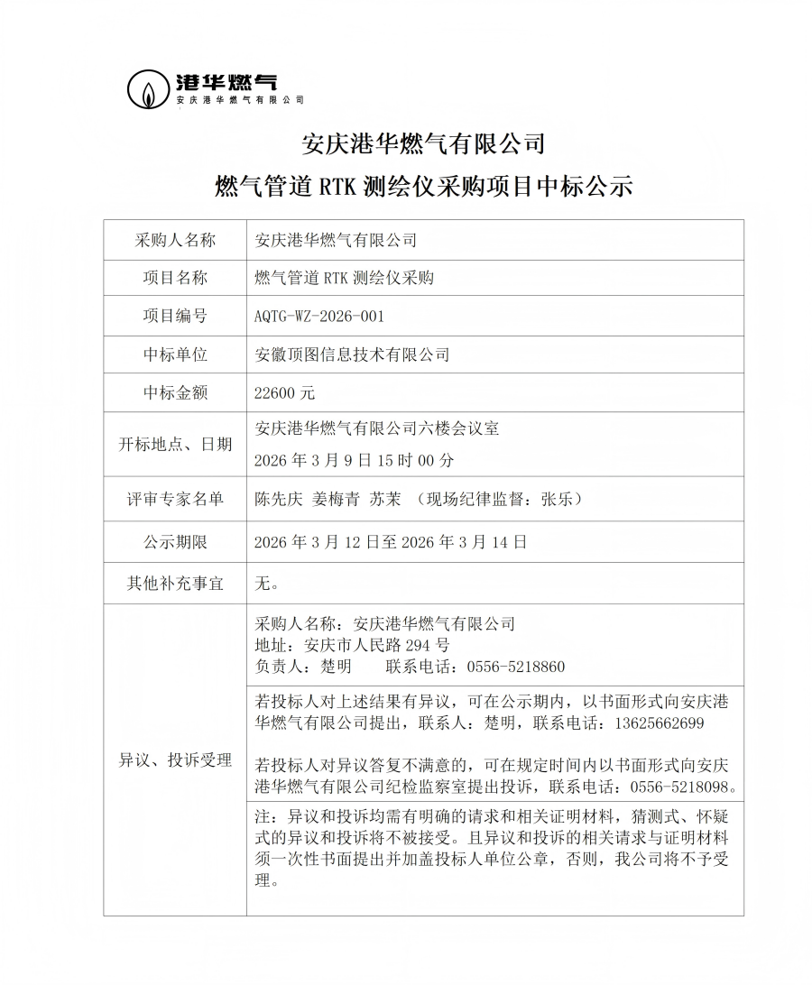 安慶港華燃氣有限公司燃氣管道RTK測繪儀采購項目中標(biāo)公示